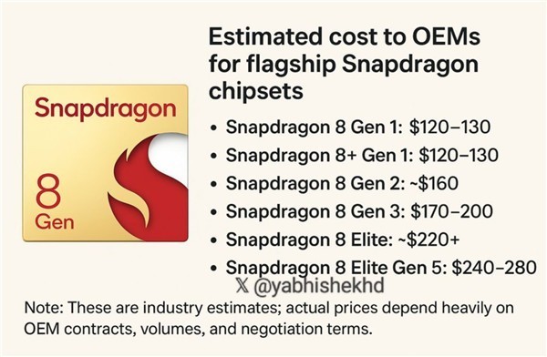 据媒体报道,高通骁龙8 Elite Gen5芯片的采购成本约为280美元,最终定价会受合约、厂商采购量及其他因素影响,但不可否认的是,这类高端芯片的成本正持续走高,甚至超出了多家手机厂商的可承受范围。
