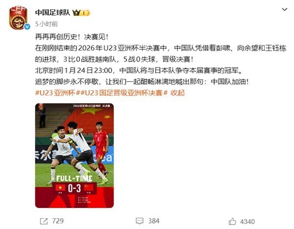 北京时间今日凌晨,U23亚洲杯半决赛,中国队凭借着彭啸、向余望和王钰栋的进球,3比0战胜越南队,5战0失球,队史首次闯入U23亚洲杯决赛!