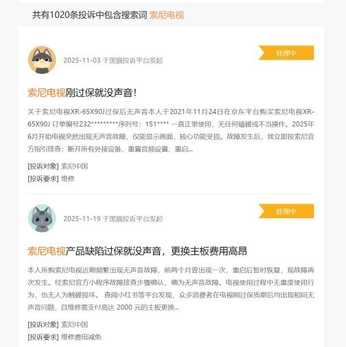 销量下滑或许主要源于质量危机。2025 年底集中爆发的 “过保无声音” 故障(涉及 XR-65X90J 等万元级机型),维修费用高达2000-3000元,客服僵化处理,导致品牌口碑断崖式下滑。黑猫投诉等平台相关投诉达上千条,“索尼大法好” 沦为 “花钱买教训”,导致用户信任崩塌。