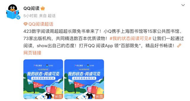 阅文集团旗下QQ阅读官微宣布在世界读书日即将到来之际,推出“数字阅读周”书单活动。该活动从4月22日持续到5月5日,期间将有超过500本优质图书进行限时免费阅读。