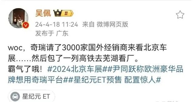 本届北京车展上,奇瑞汽车可谓是准备大展身手。据知名汽车大V吴佩透露,奇瑞邀请了3000家海外经销商参加其新车亮相活动。更令人惊叹的是,奇瑞官方还包下了一趟从北京发往芜湖的高铁,以便这些海外经销商看完北京车展后能直接参观芜湖工厂。