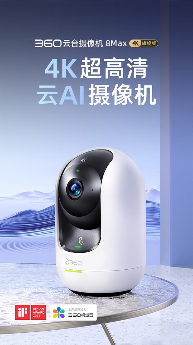 360云台摄像机8 Max 4K旗舰版上架,主打云AI功能。这款摄像头搭载800万像素4K传感器,画面分辨率为3840*2160,支持硬件级DAG HDR。它配备了1.2T算力的“双核AI芯片”,可实现8倍特写,并且在摄像机关闭时会同步遮蔽物理镜头以保护个人隐私。此外,该摄像头还支持微信视频通话功能,无需额外的App即可使用。