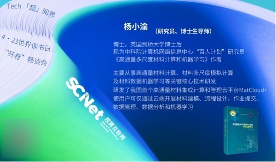 世界读书日期间,为帮助广大用户实现知识进阶、技能提升、认知跨越,国家超算互联网特举办“Tech「超」阅界”4·23世界读书日“开卷”畅谈会,邀请三位来自材料计算、计算系统生物学及人工智能领域的嘉宾进行直播分享,内容包括个人著作、私人书单、领域探索与成果、应用技能演示等。
