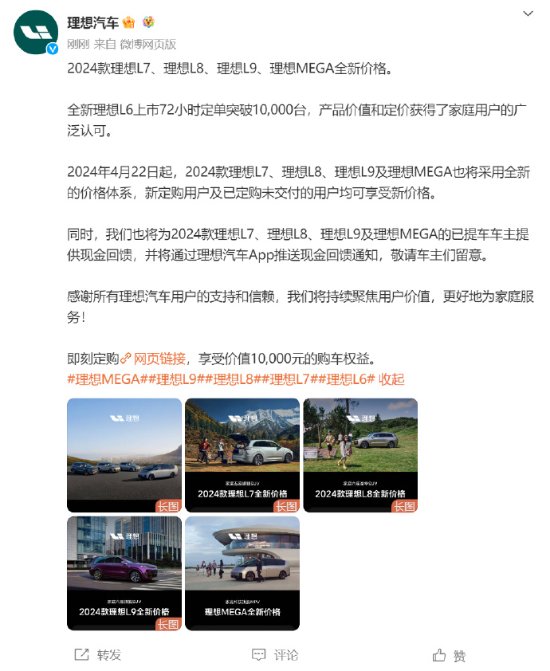 理想汽车发布降价公告,宣布对旗下L7、L8以及L9等车型进行全面的降价优惠。其中,顶配版车型降2万,低配版Pro降1.8万,MEGA车型更是直接降3万。此外,对于已经购车的车主,理想汽车将会提供现金回馈,并通过理想汽车App进行通知。