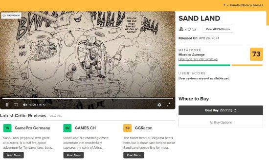《沙漠大冒险》改编自鸟山明的漫画原著,是一款万代南梦宫的新作游戏。该游戏最近收到了媒体的评价,根据收录在M站的37家媒体评论的平均分数是73分。