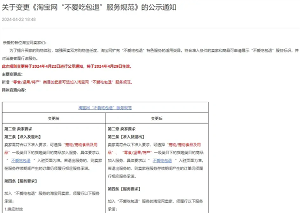 淘宝近日发布了“不爱吃包退”服务规范变更通知。据了解,这一服务最初于今年3月开始实行,仅适用于“宠物/宠物食品及用品”一级类目下指定商品。然而,现在该服务范围已经扩大至“零食/坚果/特产”一级类目下部分商品。
