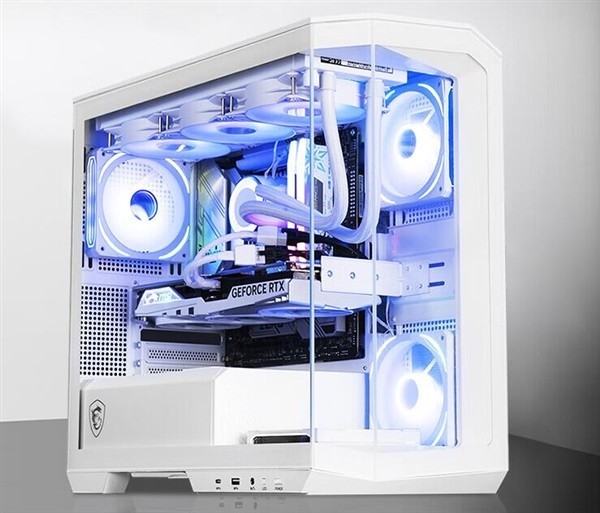 微星近日发布了宙斯盾GX海景房主机,这款主机以白色为主色调,顶配搭载了i9处理器和RTX4090显卡。主机采用了三面异形270°全侧透设计,背插主板设计使得整机内部看起来整洁清爽。