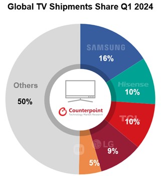 具体来看,第一季度全球电视市场出货量同比下降了4%。三星电子以16%的市场份额排名第一,其次是海信(10%)和TCL(10%)。值得注意的是,在OLED电视领域,LG电子以49%的市场份额位居第一,小米电视以5%的份额位列全球第五。