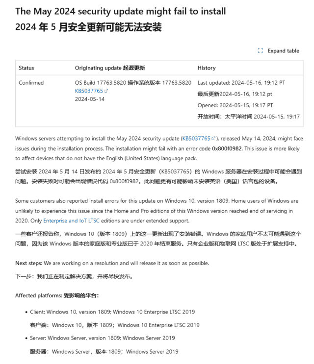 5月17日,微软近期更新了Windows健康控制台,并承认在Windows 10系统5月更新(KB5037765)中存在与Windows Server 2019相同的问题。据悉,在安装过程中可能会出现0x800f0982错误。