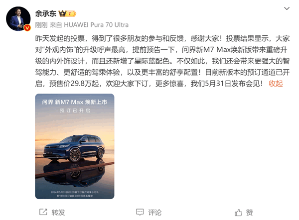 5月17日,华为的余承东先生在一篇社交媒体文章中宣布了问界新M7新版预订通道已经开启的消息,并表示预售价为29.8万起,预计将于5月31日正式发布。此外,他提到昨天进行的一次投票结果显示,用户对于问界新M7新版外观内饰升级的需求最为迫切。