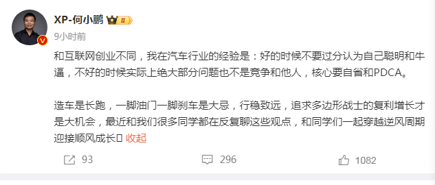 5月17日,小鹏汽车董事长何小鹏在微博上分享了自己在汽车行业的创业经验。他指出,在好的市场环境下不能过分自大,而在面临困境时问题往往不是竞争对手或他人造成的,关键在于自身反省和持续改进的PDCA循环。