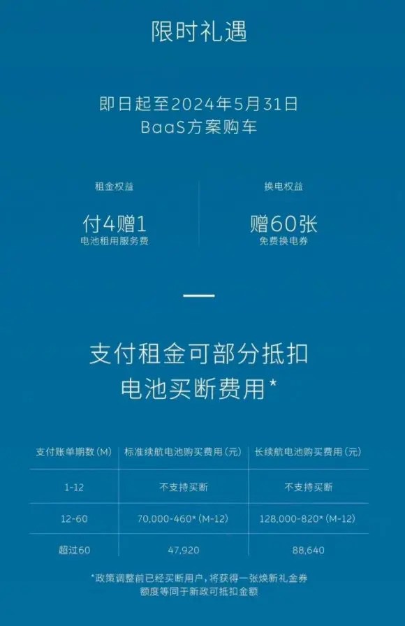 蔚来推出Baas租电限时优惠,现在购买Baas购蔚来电动车,可享受最高一万三千元的选装基金和两万元以旧换新补贴。此外,还有全车膜法套装等价值超四万元购车好礼可供选择。