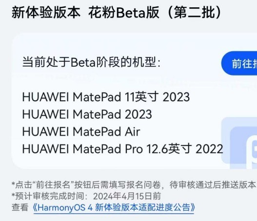 华为鸿蒙HarmonyOS 4系统新体验版本第二批现已开启“尝鲜招募”。官方表示,这一版本将带来更简单易用的操作、更纯净安全的系统以及更好的使用体验。此次尝鲜升级包括四款设备:HUAWEI MatePad 11英寸2023、HUAWEI MatePad 2023、HUAWEI MatePad Air和HUAWEI MatePad Pro 12.6英寸2023。
