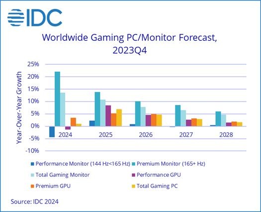 IDC预计,在游戏笔记本电脑的带动下,2024年游戏个人电脑销量将小幅增长1%。同时,游戏显示器的销量将继续保持增长势头,并在2024年达到2220万台,同比增长13.6%。