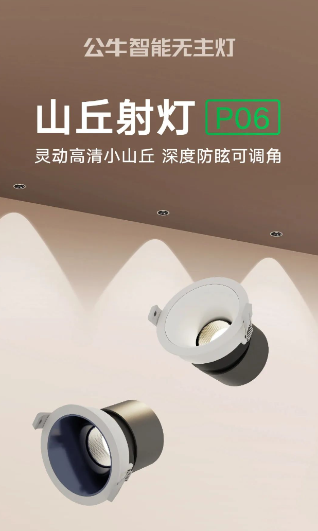 公牛开关照明于3月20日推出了一款新型山丘射灯P06,该产品支持双向调整角度。这款新产品拥有80°的山丘装饰光斑,显色指数达到了Ra90,UGR防眩指数低于13,声称即使在2.7m的常规层高下,在更接近光源的位置观看也不会对眼睛产生直射影响。