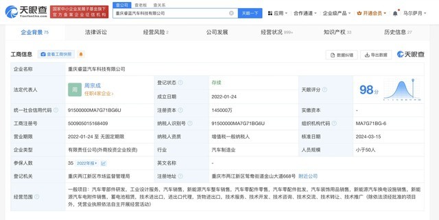 据悉,睿蓝汽车成立于2022年1月,并由力帆科技(601777.SH)与浙江吉利启征汽车科技有限公司共同持股,其中力帆科技持有55%的股份。