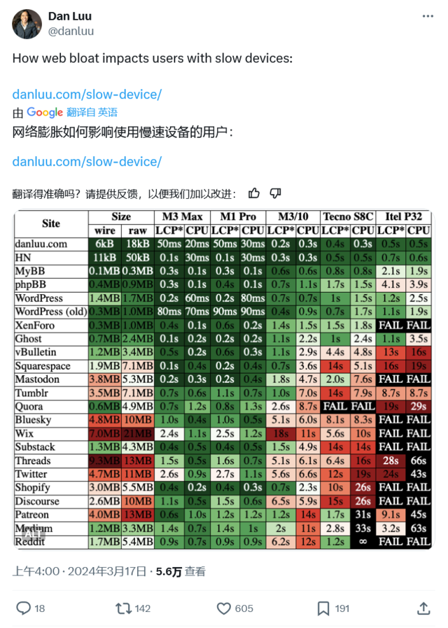 为了解决这一问题,研究者使用M3 Max Mac设备、M1 Pro Mac设备、M3 Mac设备以及最低端的itel P32手机进行了测试。结果显示,在不同设备上加载页面的速度差异明显。