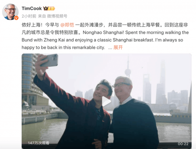 3月20日,苹果公司CEO库克在上海外滩漫步,并与演员郑恺一起品尝传统上海早餐。这次的行程可能是为了庆祝即将于3月21日在上海市区开设的Apple静安零售店。