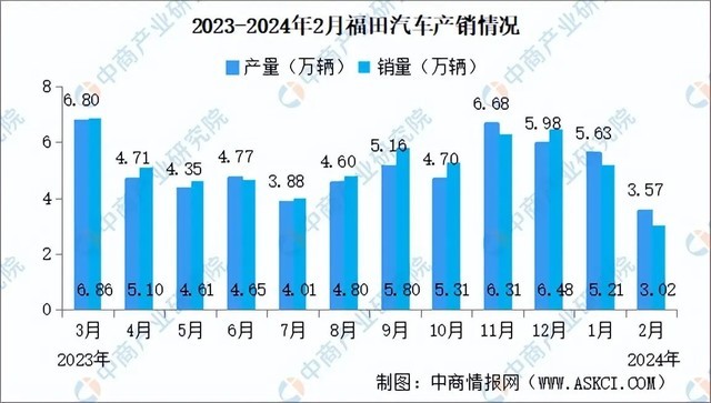 根据中商产业研究院数据库的数据,福田汽车2024年2月的汽车产量为3.57万辆,同比减少了31.88%。同时,其销量也下降了9.63%,达到3.02万辆。然而,在累计数据方面,福田汽车2024年2月的总产量同比增长了12.47%,达到了9.20万辆。此外,累计销量则同比下降了10.14%,达到了8.23万辆。