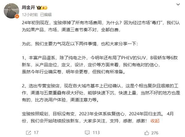 上汽通用五菱品牌事业部副总经理周钘在其个人微博上分享了宝骏汽车的现状和未来发展规划。他表示,自从2021年初以来,宝骏停掉了所有市场费用,因为他们认为如果产品、市场和渠道的节奏不对,就会白费功夫。接下来,宝骏将集中精力于两个方面:丰富产品线和选址专营店。