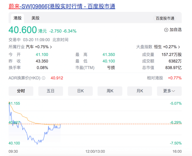 3月20日,蔚来股价在港股开盘后下跌5.19%,报41.1港元。盘中跌幅进一步扩大,一度跌逾7%,创上市以来新低。