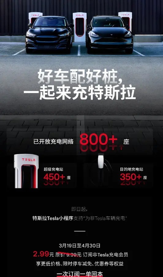 另外,特斯拉还推出了一项名为“超级充电会员”的服务,用户可以通过微信小程序或特斯拉App查看向非特斯拉车辆开放的充电站。现在只需要2.99元就能订阅该会员,享受更低价格、限时免停以及优惠券等权益。