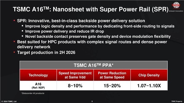 根据台积电的说法,相比N2P制程,A16在相同Vdd(工作电压)下性能提升8-10%,在相同速度下,功耗降低15-20%,晶片密度高达1.10倍,特别适用于具有复杂讯号线路和高密度供电线路的高性能计算(High-Performance Computing,HPC)产品。