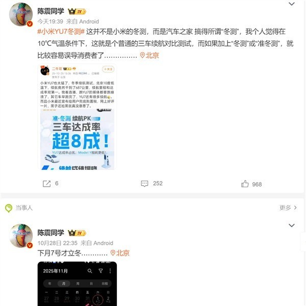 陈震发文称:“这并不是小米的冬测,而是汽车之家搞得所谓‘冬测’,我个人觉得在10℃气温条件下,这就是个普通的三车续航对比测试,而如果加上‘冬测’或‘准冬测’,就比较容易误导消费者了……”